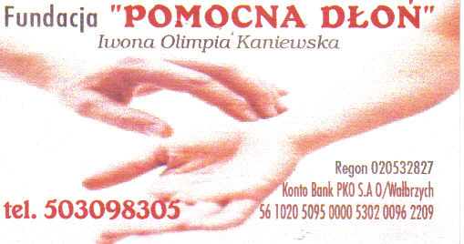 „Pomocna Dłoń” 58-372 Boguszów-Gorce tel. 0503098305 e-mail: serce@free.ngo.pl lub: despina1@wp.pl www: http://serce.free.ngo.pl/ |