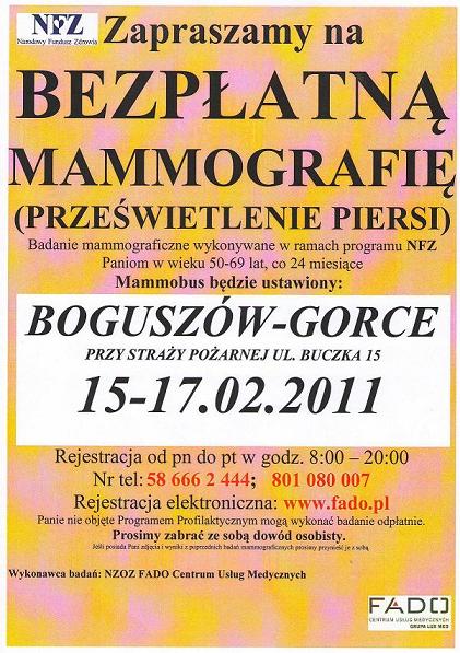 BEZPŁATNE BADANIA MAMMOGRAFICZNE W dniach od 15 do 17 lutego przeprowadzona została w naszym mieście, akcja bezpłatnych badań mammograficznych. Akcja cieszyła się ogromnym zainteresowaniem. W przeciągu 3 dni przebadanych zostało 180 pań.